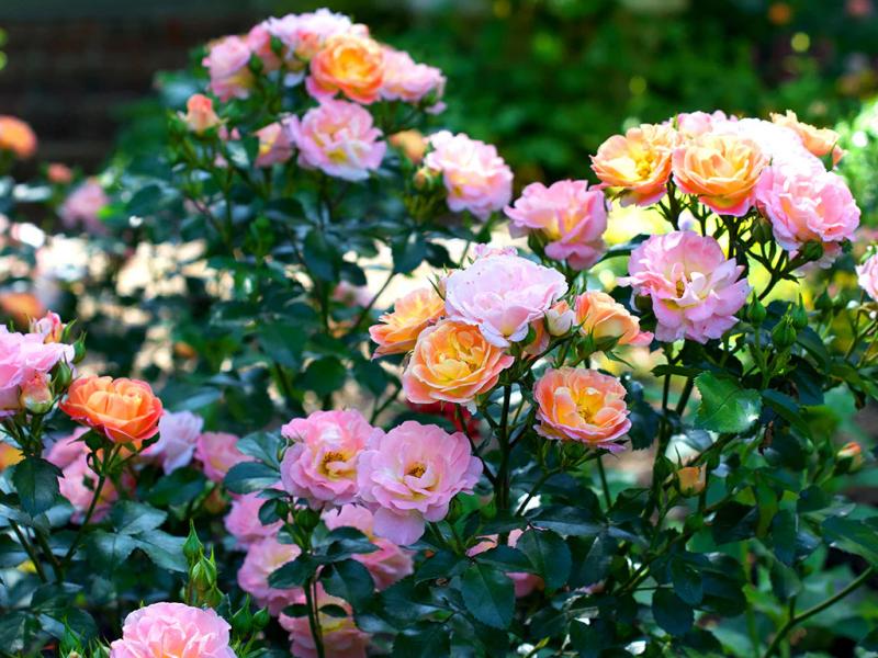 One of the most floriferous dwarf shrubs available! Soft double peach blooms from spring to frost, with 19-20 pretty petals. Few thorns. Medium green glossy foliage. Gorgeous in borders and containers.