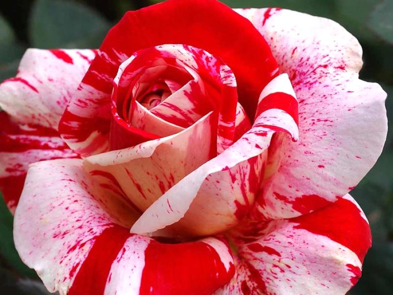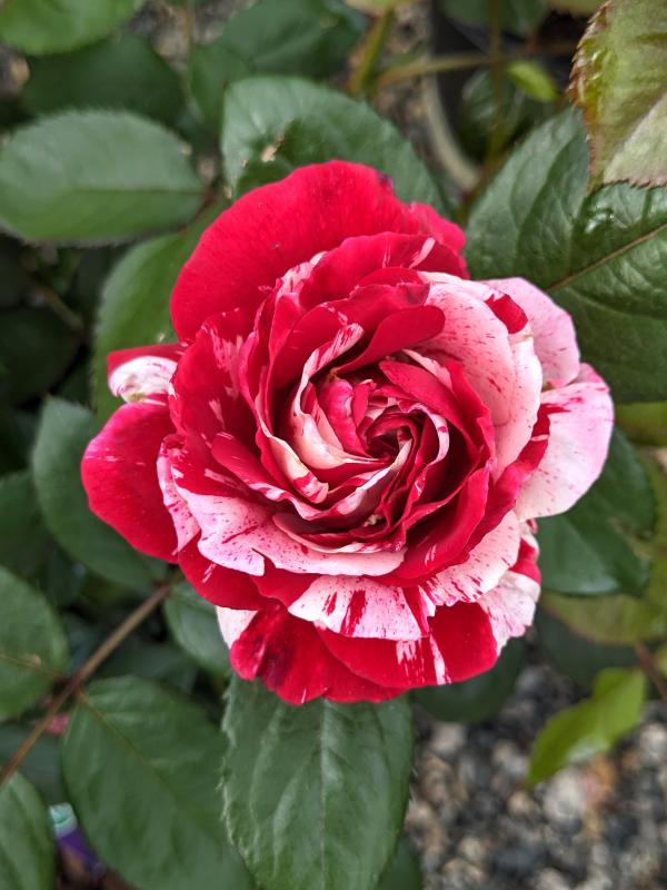 Breathtakingly beautiful burgundy-red swirled with creamy-white stripes. Fully double 4.75” blooms, with 17-25 petals per incredible flower. Flowers appear in clusters of 3-5 per stem. Dark green leathery foliage. Excellent dried for potpourri.