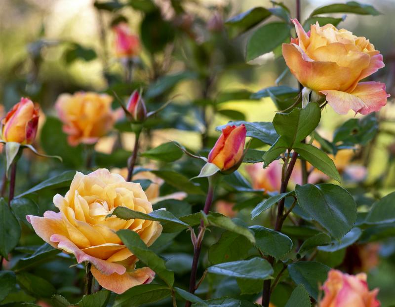 Fully double, 4-5" blossoms, with 30-37 petals that are rich golden-yellow highlighted with orange-pink. Enjoy large clusters of gorgeous cupped blooms during the growing season. Long-lasting blooms on long stems are perfect for cutting. Vigorous, with glossy dark green foliage. Tall, slender growth habit. Heat tolerant once established. Bred in America by Carruth.