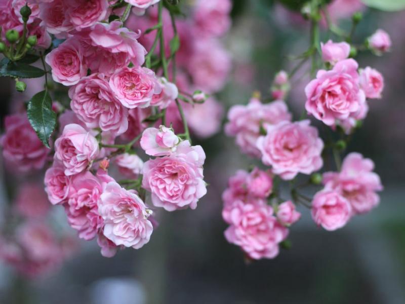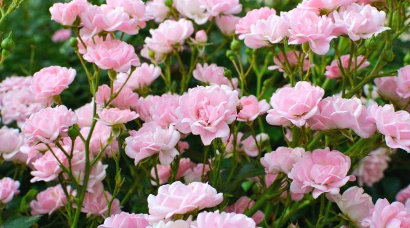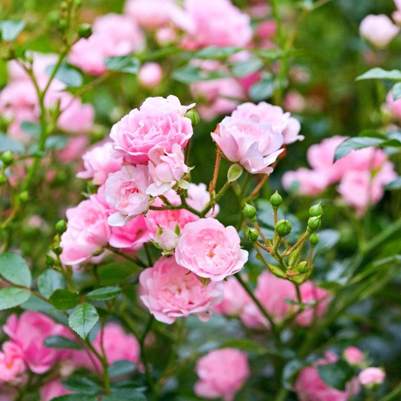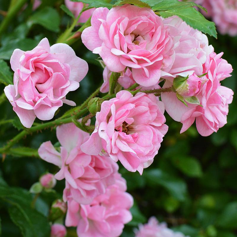 Rosa xSprays of tiny (1.5"), soft pink pompon flowers, filled with 25 petals each. Starts to flower late, then very floriferous. Graceful spreading growth - wonderful ground cover, low hedge, or in a mixed border. Summer heat may turn the flowers to a paler color. A beloved garden rose since 1932.