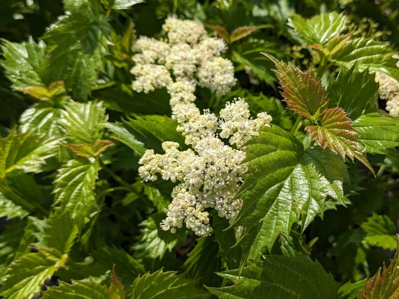 WNC Native. White, flat-topped flowers in late spring, ink-blue fruits in September, and yellow to wine-red fall color. Makes a great informal hedge, and massed. Attracts butterflies, bees, birds (Eastern Bluebird, Northern Flicker, Gray Catbird, and American Robin), and more.