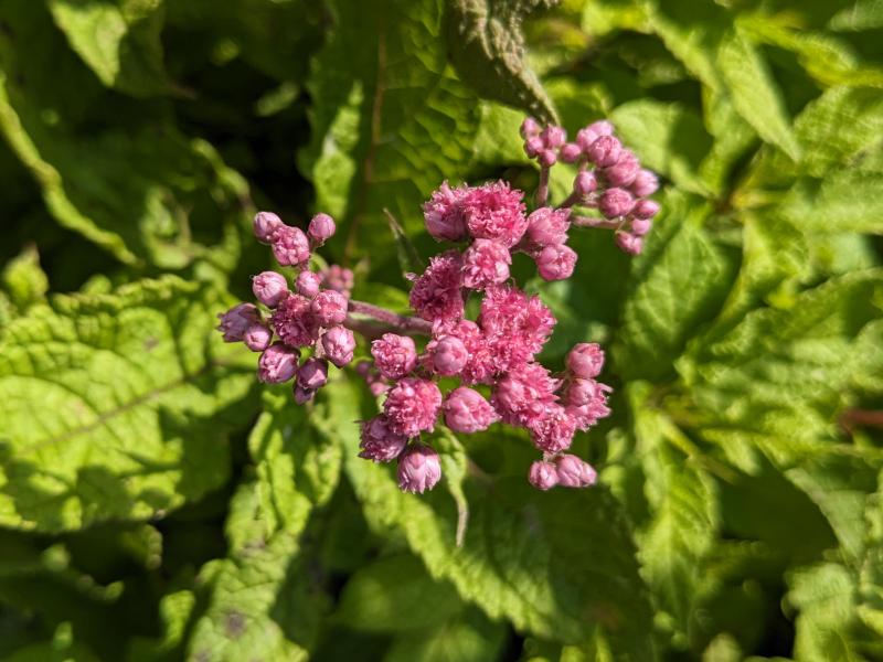 Species is native to WNC. 'JoJo' is an exciting, compact selection of Eupatorium fistulosum, featuring vibrant pink double (sterile) flowers, maroon-red stems, and a freely flowering habit.