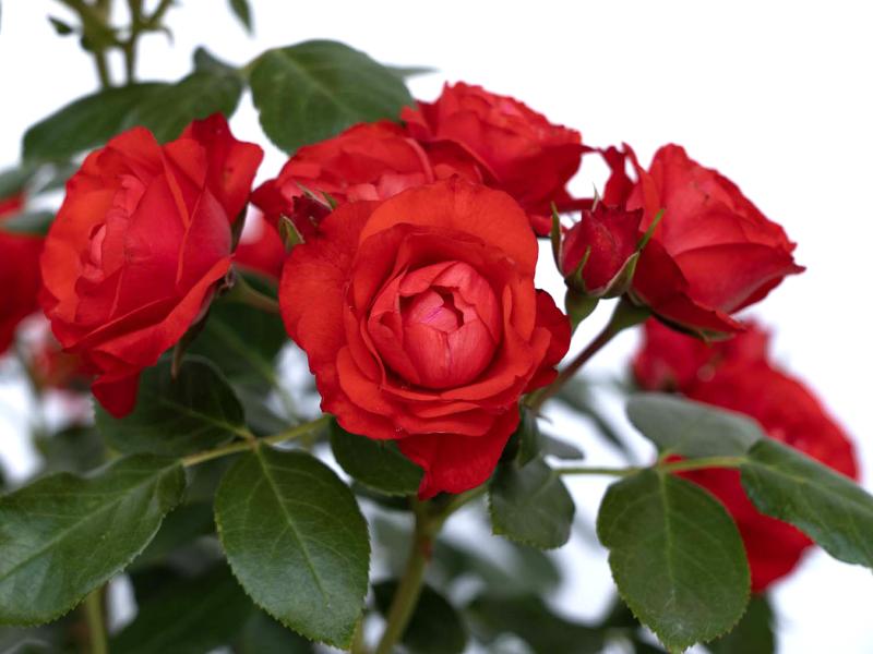 Rose - Floribunda - Brick House® Orange Award winning! Vibrant, bright orange-red flowers with 18-20 petals each, framed by dark green matte foliage. Bushy and low maintenance. Repeat bloomer with generous flowers each wave. 2.5’T x 2.5’W. Zones 5-11.