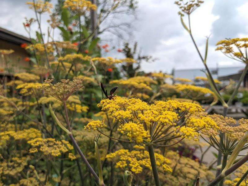 Soft, feathery, smoky foliage with mustard yellow flowers adds mystery to the garden. Bulbs, foliage, and seeds are all edible with an anise flavor. History of culinary and herbal usage. Attracts butterflies, beneficial hoverflies, and more. Prefers moist, well-draining soil. Harvest seed heads before they turn brown.