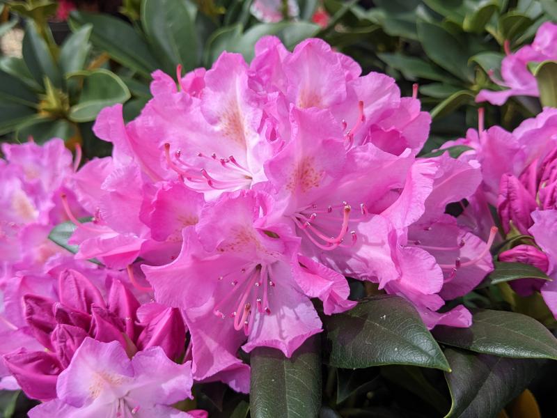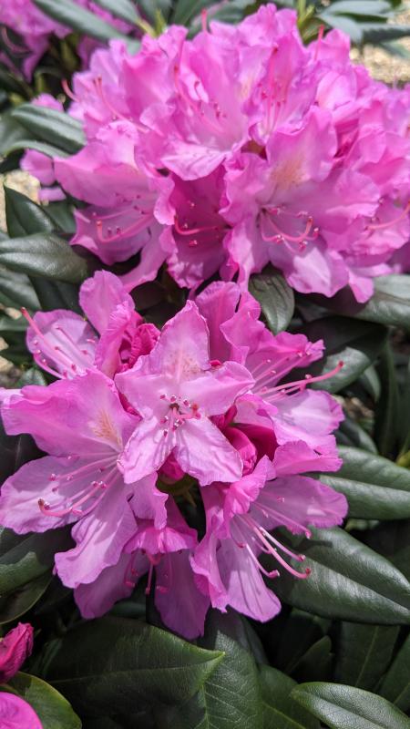 Smothered in stunning clusters of pink trumpet-shaped flowers with lavender overtones and dark red spots. Distinctive purple flower buds emerge from the ends of the branches in mid spring. It has dark green foliage. Evergreen.