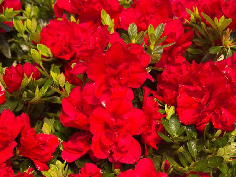 A fast-growing dwarf azalea, the Autumn Bonfire glows with numerous, true, red, 2.5” semi-double and single blooms in spring, summer, and fall. Excellent foundation plantings and massed. Evergreen. Prefers morning sun, afternoon shade, and moist, well-draining soil.