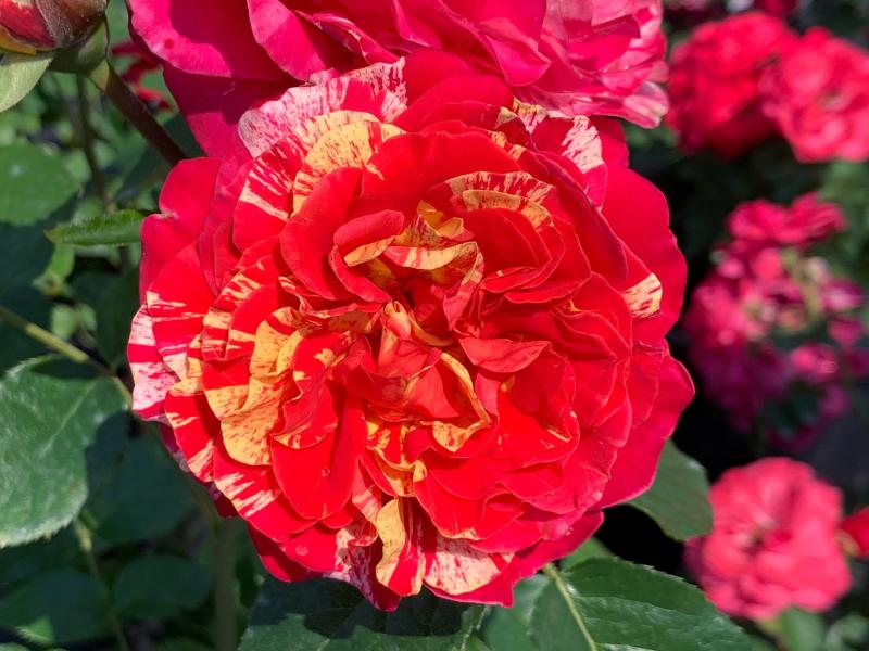 Earning your stripes is easy with this rose: just plant and enjoy! Each bloom offers a spectacular palette of cherry red and fuchsia petals striped with yellow. A compact and vigorous Floribunda.