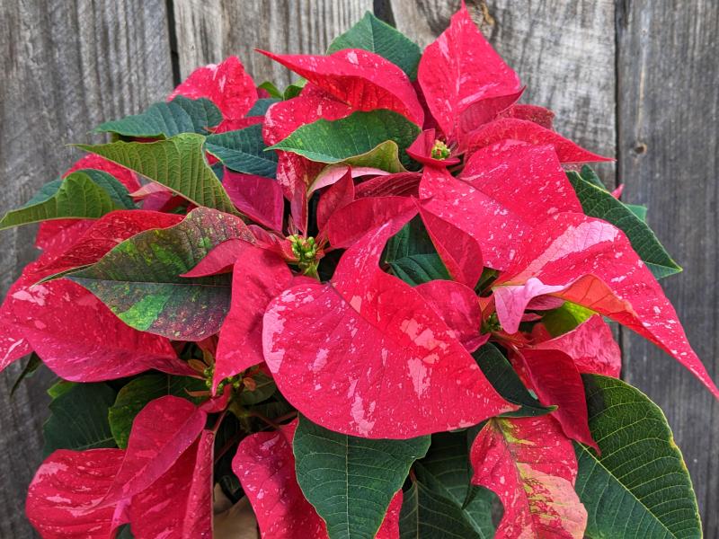 RARE. Stunning red bracts flecked with pink to white, like a modernist painting. Spice up your holidays and beyond with these incredible and unusual beauties. These distinctive poinsettias brings artistic flair to any space with their one-of-a-kind coloring that sets them apart from traditional Poinsettias.