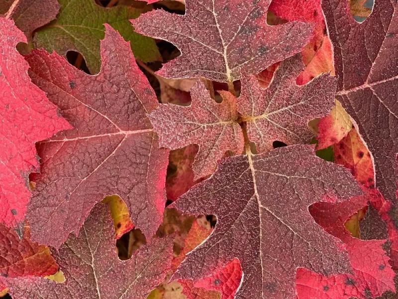 Compact native shrub native to the US South with oversized leaves and massive, ball-shaped white flowers that mature to lime green. Glorious fall foliage is a blend of dramatic burgundies and red tones.