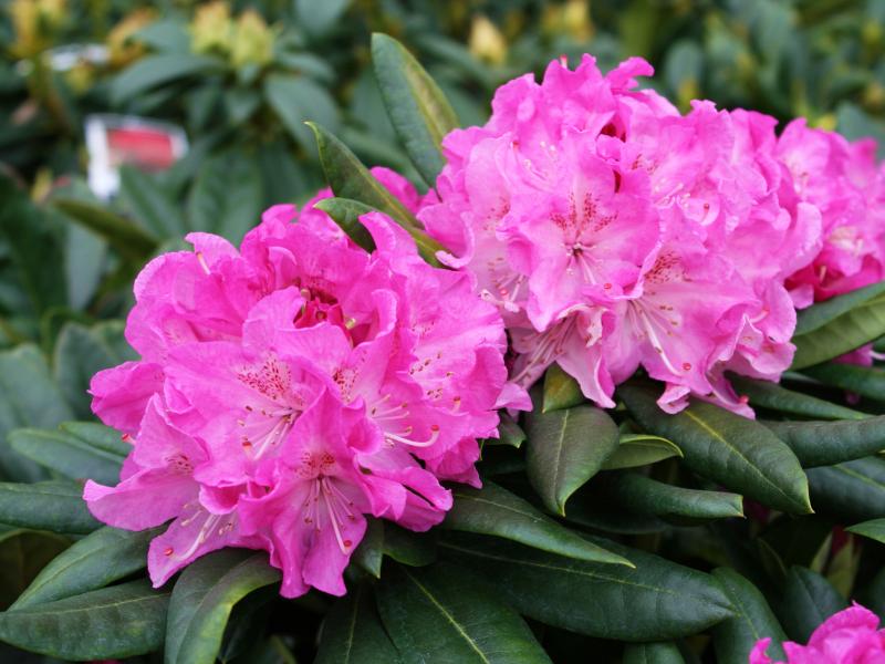 NATIVAR. Beautiful 2½"  flowers, bright rosy-pink with dark red blotches. The funnel-shaped flowers are held in conical-shaped trusses, backed by lustrous dark green evergreen foliage. They bloom early Midseason to Midseason.