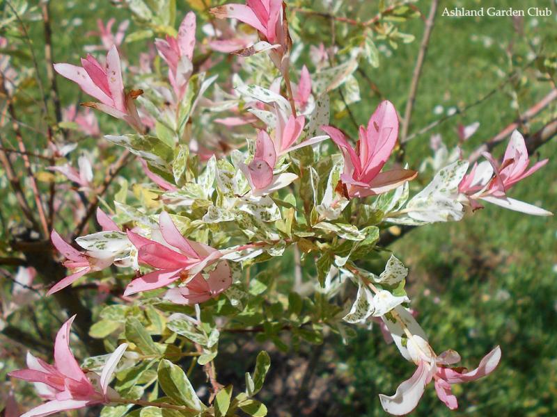 Unusual, and beautifully variegated. Young foliage is completely pink, aging to cream and then to light green with white mottling. Fall brings salmon pink stems. Grows as an upright and spreading shrub. Native to Asia, where it grows along streambanks.