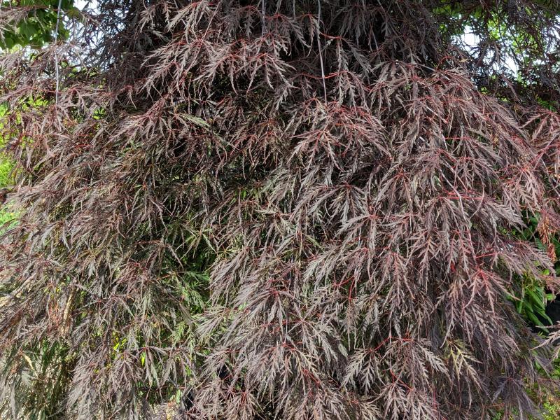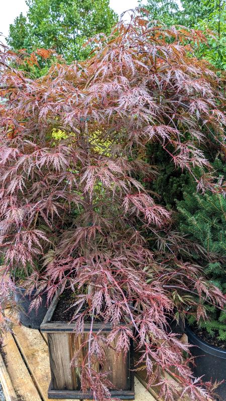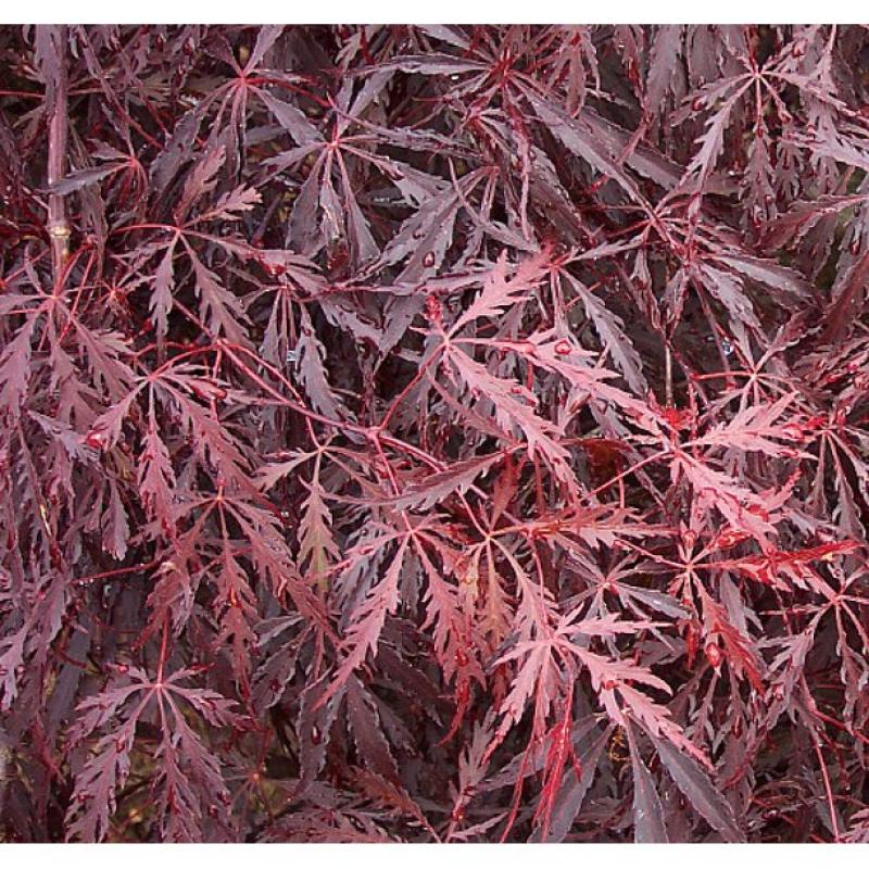 A graceful, mounding, dwarf tree with waxy deep red bark, and beautiful cascading branches. Deeply lobed new foliage is deep crimson-red changing to a beautiful purple-red throughout the summer, turning bright scarlet- red in the fall. Good heat and humidity tolerance. Slow grower, ideal small specimen in entry ways and containers.