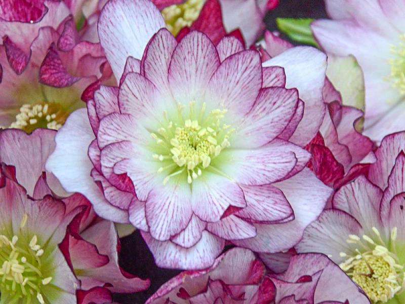 Beautiful Blushing Bridesmaids look fabulous in their ruffles! Rich raspberry pink veining and matching picotee edges highlight the abundant 2” snow-white double blossoms.