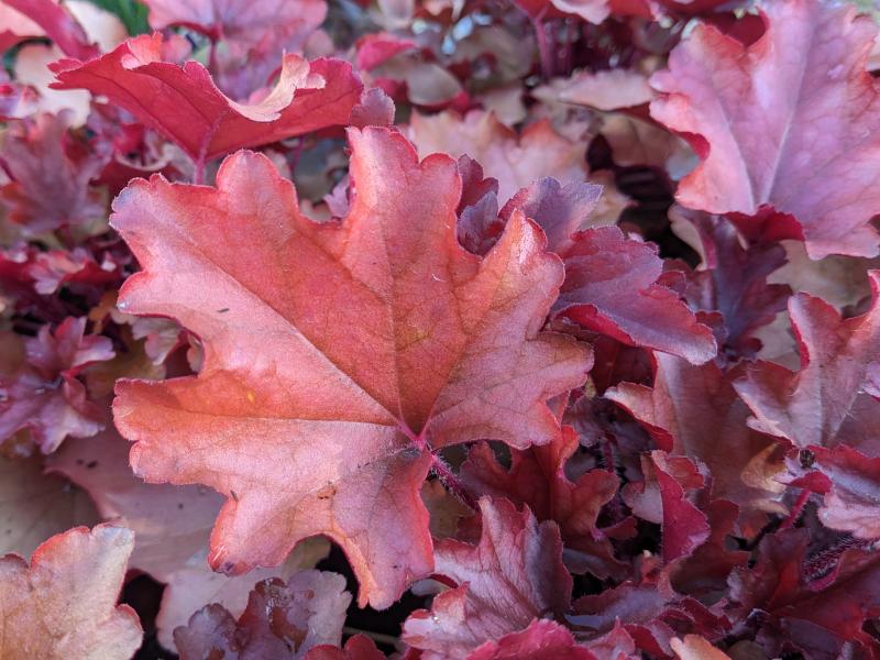 'Peach Flambe' Coral Bells is a particularly delightful form of hybrid Heuchera, with stunningly vibrant peachy-red foliage for shady spaces. Summer brings thin flower stalks (up to 16" tall) with tiny fairy-sized white bell-shaped flowers.