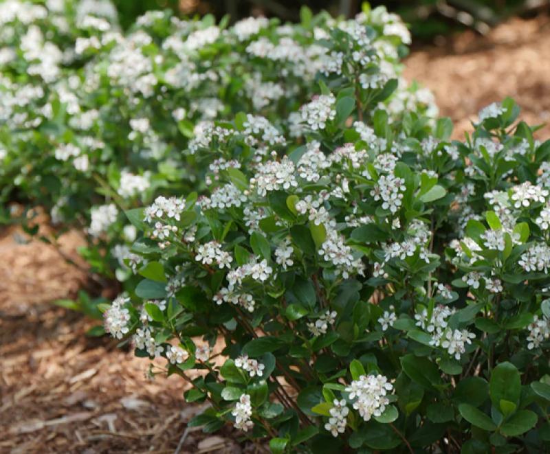 Dainty white spring flowers atop glossy green foliage. Attractive in the fall with brilliant red foliage and purple-black fruit. Low mounding habit, excellent massed. Very tough and resilient. Species is a WNC Native.