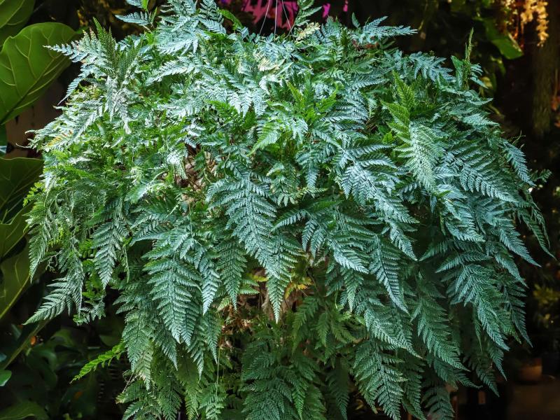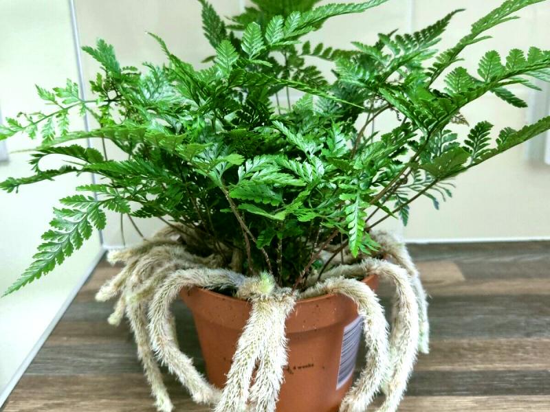 Rabbit's Foot Fern Davallia fejeensis Fantastic furry creeping rhizomes resemble rabbit feet, topped with gorgeous, finely textured fronds. Native to tropical forests in Fiji, this epiphytic fern grows on trees and rocks in the wild. Prefers high humidity, medium to low light, and moist, well-draining soil. Slow growing. They are happiest in bathrooms, near kitchen sinks, in terrariums, and/or with having a pet humidifier. Go easy on fertilizer; repot infrequently to let rhizomes flourish. 1-3’T x 1-4’W. Keep above 60°F.