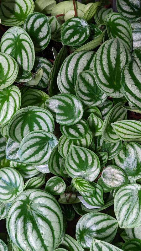 Delightfully delicious dark green stripes on plump, waxy foliage resemble watermelons, atop contrasting red stems. Native to South America.