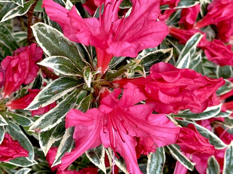 Azalea 'Girards The Robe' Rhododendron x ‘Girards The Robe’ (Girard hybrid) Stunning clusters of magenta-pink, trumpet-shaped flowers. Uniquely variegated evergreen foliage creates a gorgeous contrast to the pink blooms. Dense, somewhat upright growth habit. Slow grower. Zone 6. 3’T x 3’W.