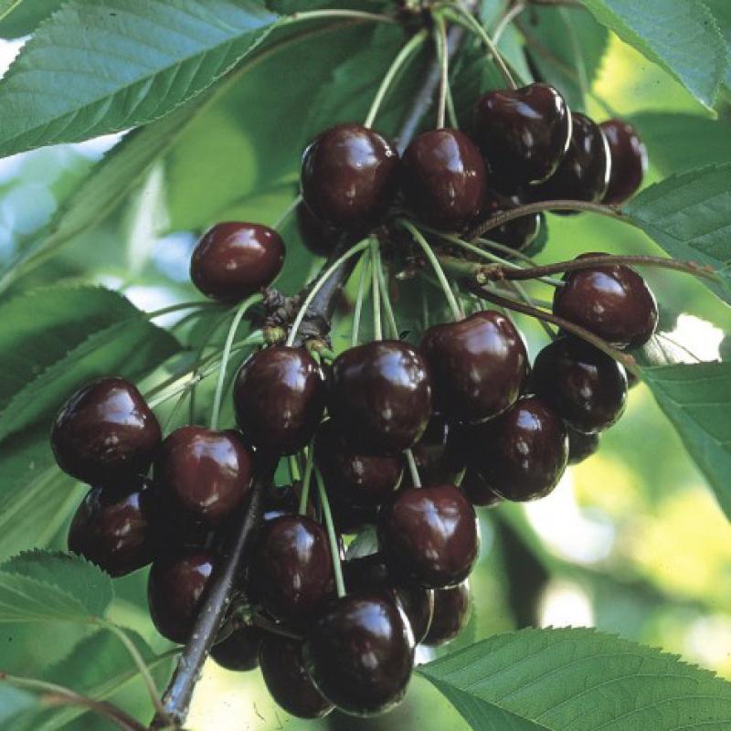 Bold and vigorous. Fruit is sweet-tart when picked red; superbly sweet if picked deep purple, when fully ripe. Strong flavor with a good balance of natural sugars and acidity coupled with high “cherry essence”. Blooms late to avoid spring frosts. Crack resistant. Clingstone. Keeps well in proper storage. From Germany in 1998. Ripens late June. Pollinator required: Any other sweet cherry except Van.