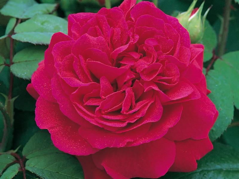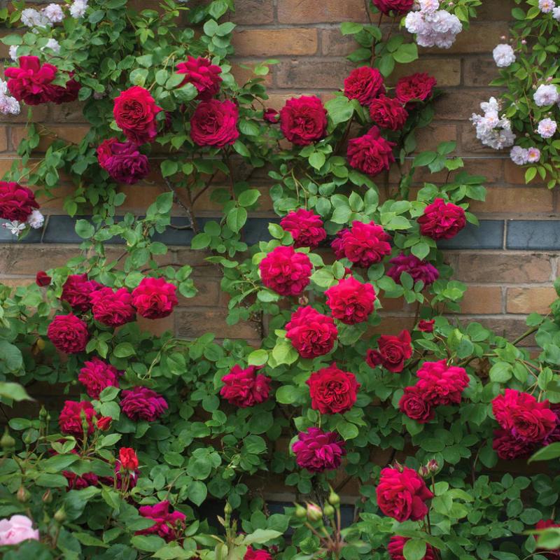 A striking climber bearing large, bright crimson-red blooms packed with up to 110 petals. It is a relatively compact climber clothed in large, dark green leaves. This is a "nodding" rose, so when you grow her up on a trellis, the flowers will be facing down at you.
