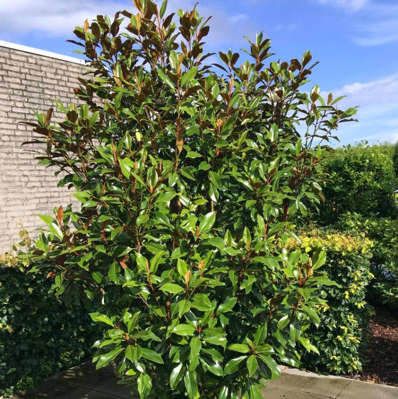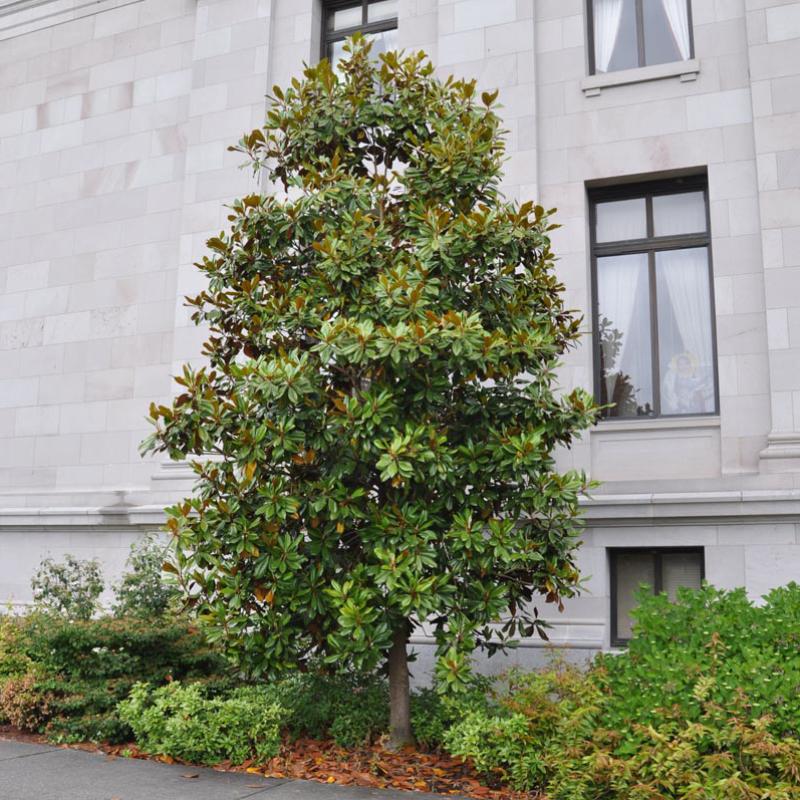 Extremely glossy, bright green leaves with deep orange-brown furry undersides. Creamy white, fragrant flowers in summer. Growth is fast. Habit is upright and columnar, making these an excellent choice for tight locations.