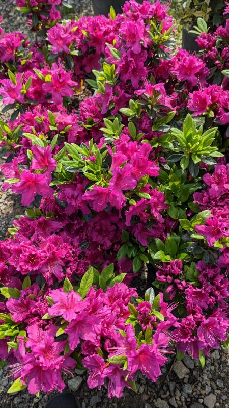 A stunning profusion of single, fuchsia-colored blooms blankets the lush, dark green glossy foliage in the spring. Evergreen. Early to mid season. A premier flowering shrub for use as a hedge, in borders or massed.